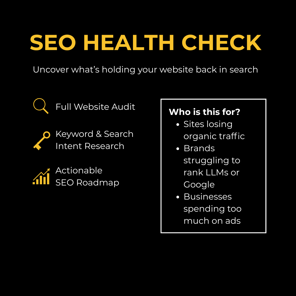 With an SEO Health Check, you’ll gain clarity on what’s working, what’s holding you back, and a clear roadmap to grow your website’s visibility—so your site works smarter, not harder.